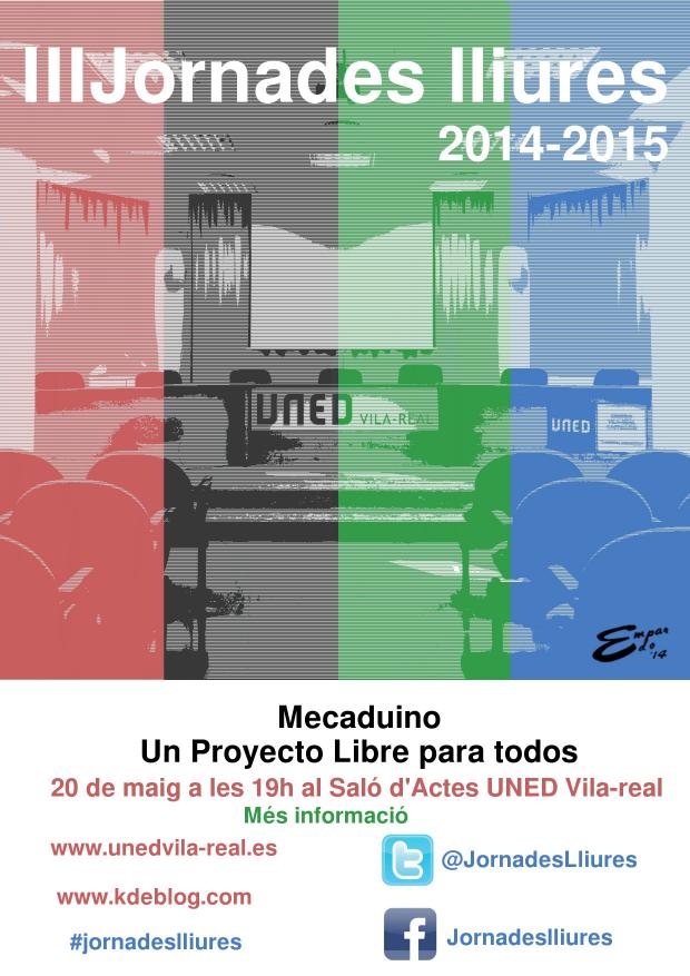 El próximo 20 de mayo en el Centro Asociado de la UNED de Vila-real, a las 18 horas dará comienzo una intensa sesión de las III Jornadas Libres con la realización consecutiva de dos charlas: «Que no te tomen el pelo con el Feisbuc» de Jonathan Secanella, y «Mecaduino, un proyecto libre para todos» de José Cerisuelo.